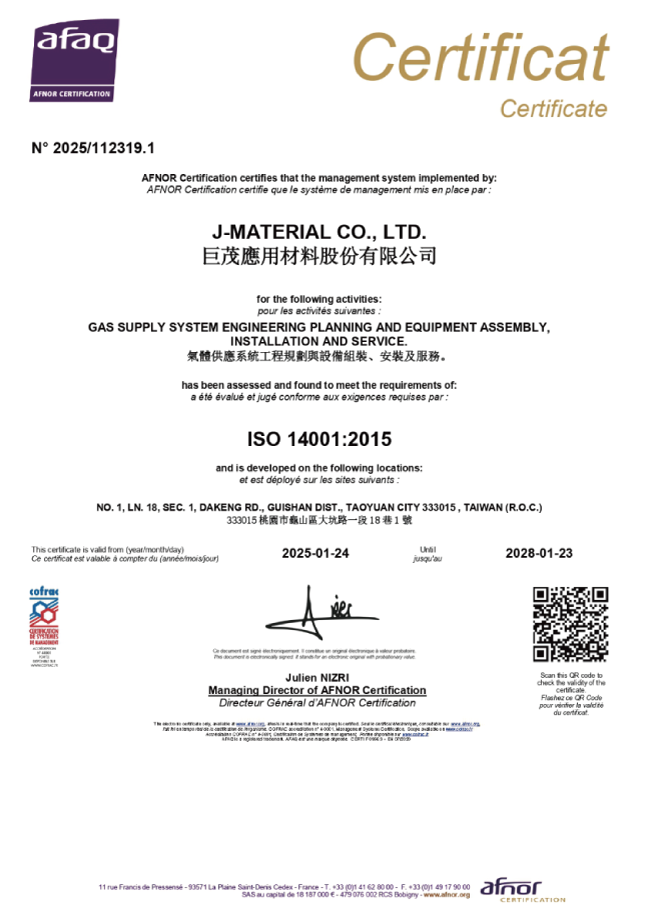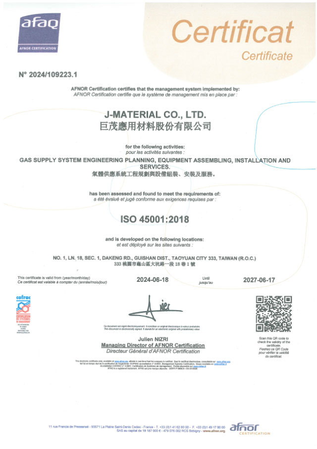 本公司在全體員工努力下,在2016年3月J-MATERIAL獲得證書和安全評估報告,我們通過文件審查, 審計, 整體功能安全評估, 電氣安全相關需求審查, 最終評估及現場測試, 報告製作,技術支援等基本評估程序,於2016年3月J-MATERIAL自製設備通過了SEMI S2設備環境衛生安全基準認證,經由國際認證肯定J-MATERIAL設備的結構與功能安全性;SEMI S6半導體製造設備通風排氣,我們採用高效益設計的排氣通風設施可防止人員、財產及環境之健康與安全受到不必要的傷害,我們比你們更重視你們的安全;SEMI S22半導體製造設備電器設計安全我們於設計的過程中消除危害,縱使勞工疏忽或機械組件故障也不致於造成危險,而導致職業災害的發生。